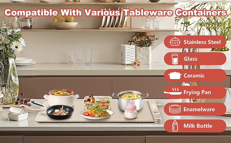• 【Compatible with a Variety of Tableware】: This electric warming tray is compatible with a variety of different materials such as glass, stainless steel, enamel and ceramics, as long as it is heat-resistant tableware can be used. Tip: Due to the large amount of heat generated during the use of the product, it is not recommended to use this product on a flat surface that is not heat resistant. In order to use the food warming mat safely, we recommend using a heat-resistant mat to protect the countertop.
