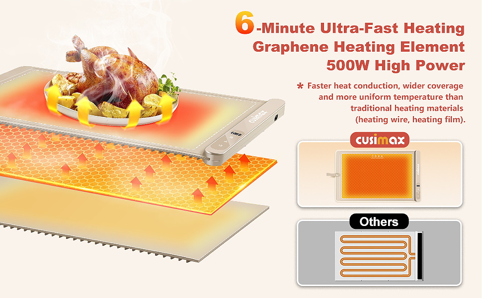 • 【Adjustable 6 Levels of Temperature Control】This food warming mat offers 6 levels of temperature from (50℃-100℃/122℉-212℉), with 8 seconds 500W high efficiency heating to heat up quickly, which can meet the needs of food warming, defrosting and so on. Our electric warming tray are convenient for you to prepare meals efficiently. The precise adjustment of temperature conveniently allows you to keep your food warm and tasty for a long time, enhancing your dining experience.