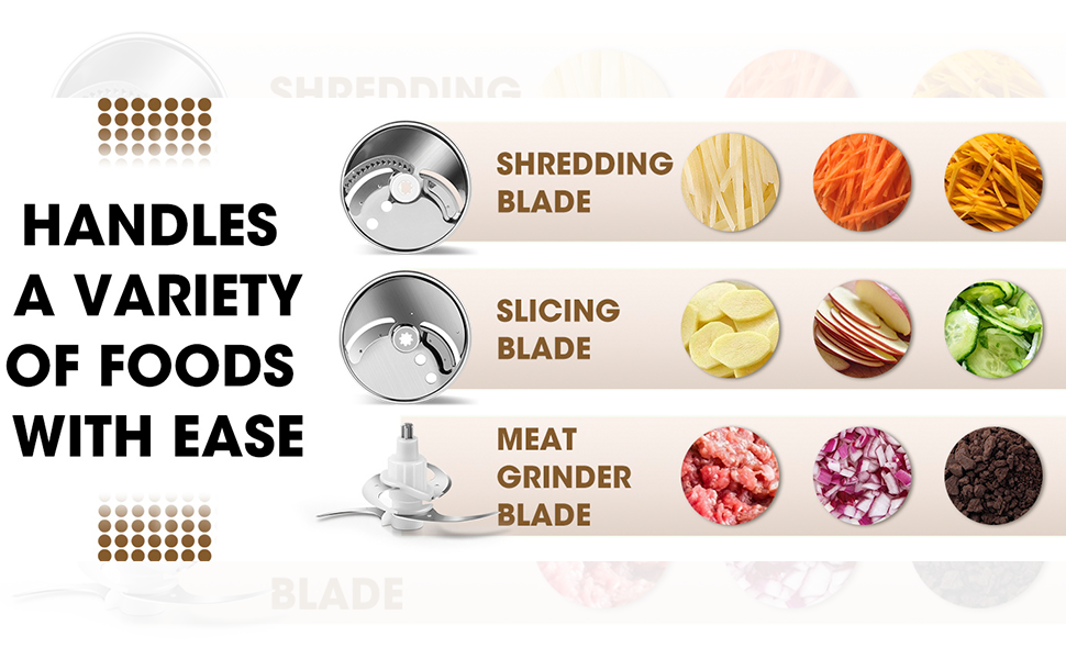 • 3-IN-1 -- Multi-function food processor with shredding, slicing and grating. Shredding and slicing down to 1mm thick, cheese, zucchini, potatoes, squash, carrots and more are easy to handle. The grating blade doubles as a pulverizer and delivers the powdered results you need in 10 seconds for crackers, nuts, ice, garlic and more