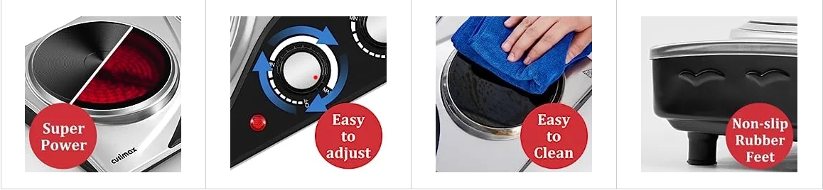 All Cusimax products have passed ETL certification and meet safety standards. Cusimax countertop cooktops feature an automatic safety shut-off. When you step away from the hot plate for a long time, the panel will start to burn dry, then the auto shut-off will turn on for overheat protection. In addition, the non-slip feet ensure that the unit stays firmly in place.