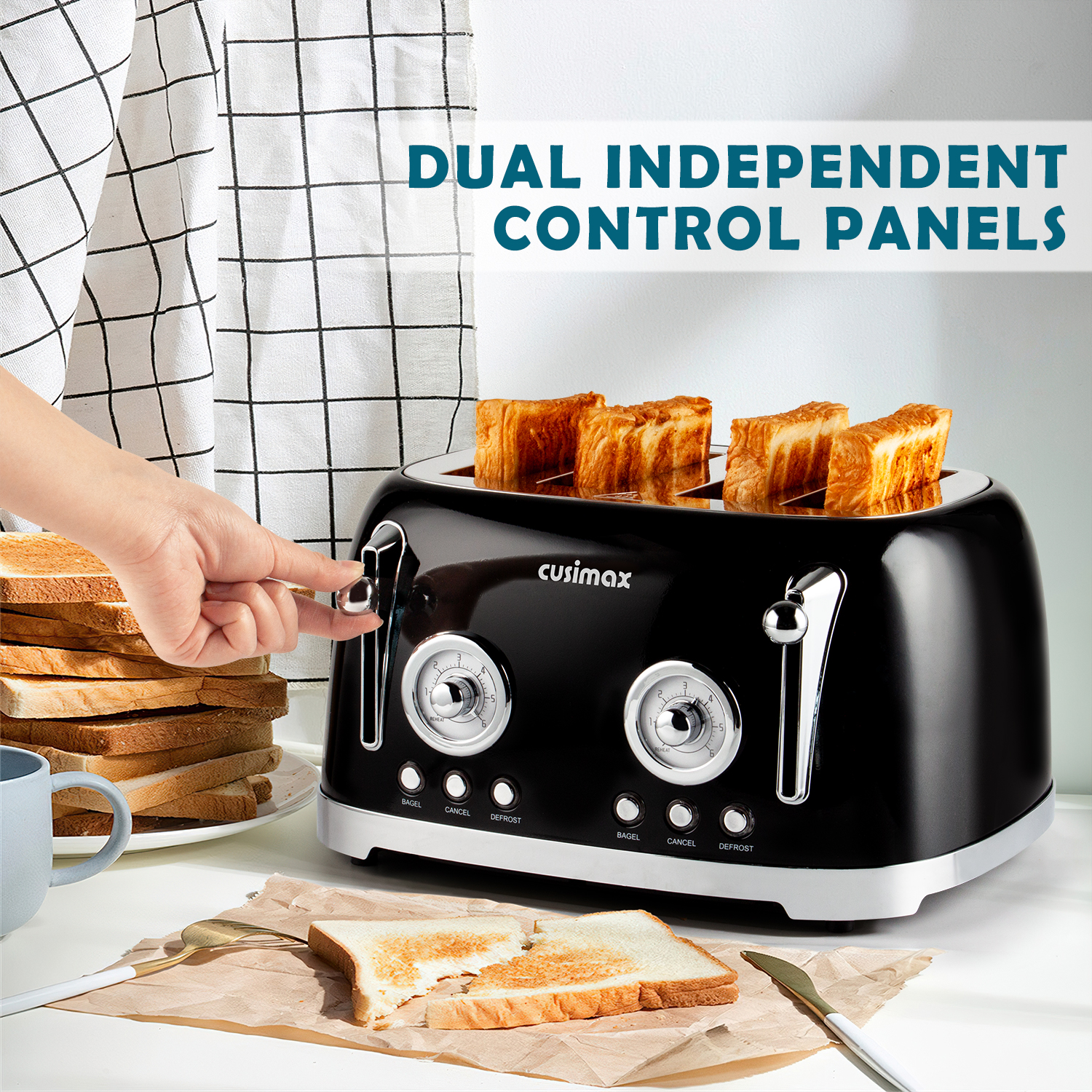 Cusimax toaster 4 slice is designed with 2 separate control panels, so not only can use one side individually, but also can use different functions at the same time to make different types of bread, making it perfect for preparing delicious breakfasts for your family!